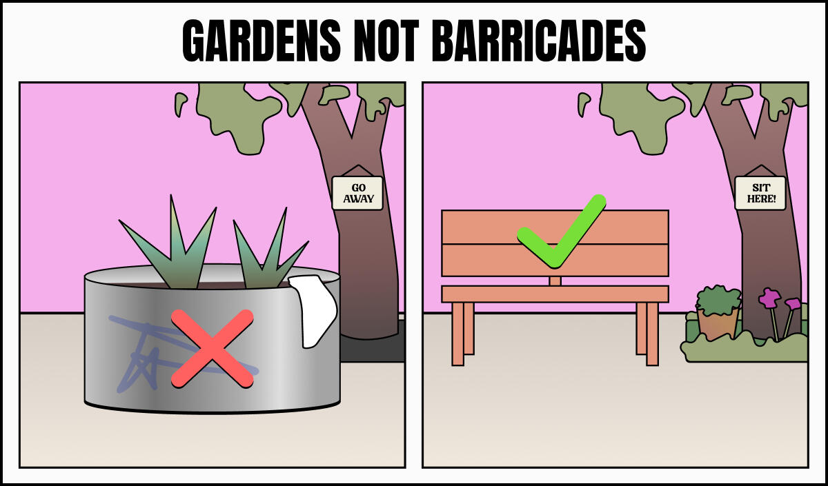 Gardens Not Barricades is demanding that the city write and enforce guidelines that will prevent abusive and hostile planter installations and save our sidewalks.